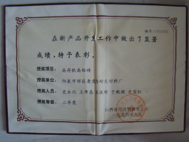 熱風(fēng)爐用低蠕變高鋁磚、高荷軟高鋁磚獲省科技進(jìn)步二等獎(jiǎng),微膨脹高鋁磚列入火炬計(jì)劃項(xiàng)目,炭素焙燒爐用特種高鋁磚已批準(zhǔn)國家專利